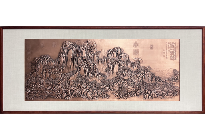 此壁畫采用非遺工藝——金屬鍛鏨——手工制作而成,匠人所鏨線條勁健秀逸,如綿里裹針,再現(xiàn)了原作“氣象蕭疏、煙林清曠”的畫境。