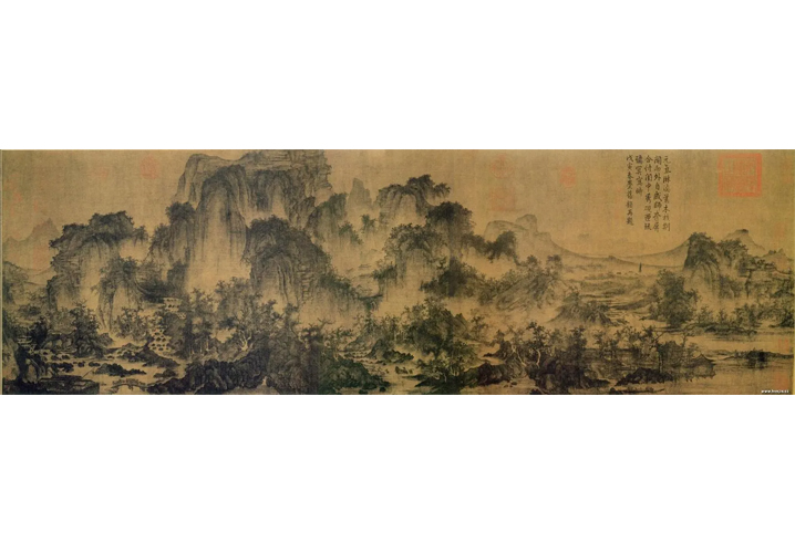 本作品取材自北宋李成的畫作《茂林遠岫圖》。李成,李唐宗室后裔,少時博通經(jīng)史、學識淹貫,因滿懷抱負不得施展,故寄情于詩酒書畫,與關仝、范寬并稱北宋山水畫三大家。