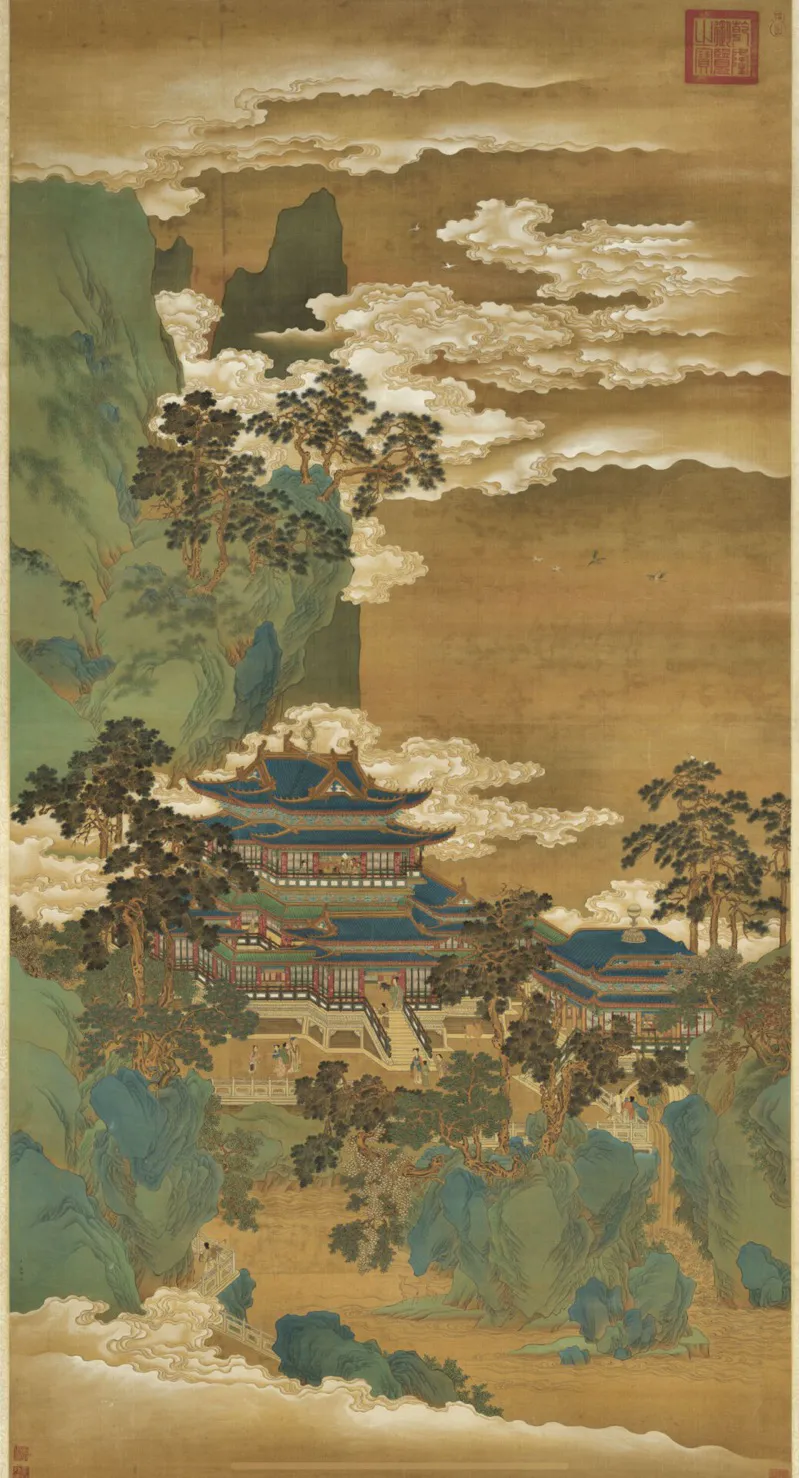 本作品取材自《仙山樓閣圖》,相傳為北宋趙伯駒所作,畫面瑰麗,想象雄奇,極富浪漫主義色彩。趙伯駒是南宋時(shí)期青綠山水畫的杰出代表之一,他的作品場(chǎng)面宏大,氣勢(shì)壯闊,在青綠山水畫的發(fā)展史上舉足輕重,對(duì)后世的山水畫家產(chǎn)生了深遠(yuǎn)的影響,仇英、王希孟等一批著名畫家都受到了他的畫風(fēng)的影響。