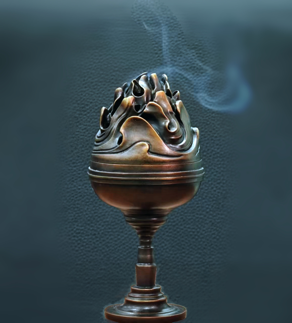 金屬公司出品的博山爐頂部高而尖,仿佛錯(cuò)落分布的群山,匠人巧妙的借山勢鏤孔,當(dāng)爐中的香料點(diǎn)燃時(shí),香煙從鏤孔處裊裊而出,有如仙氣繚繞在山巒間,給人以置身仙境的感覺,加上幽香陣陣,使眼前的“仙境”不僅有形象,而且有氣味。除了焚香,博山爐還可以用來熏衣、熏被,以達(dá)到除味、避穢的效果。