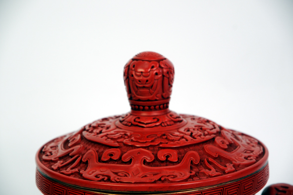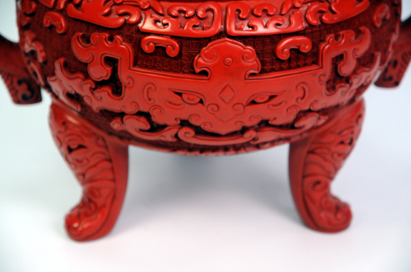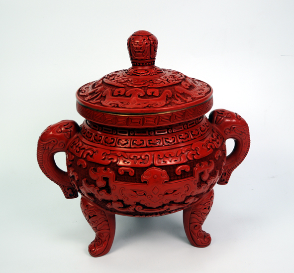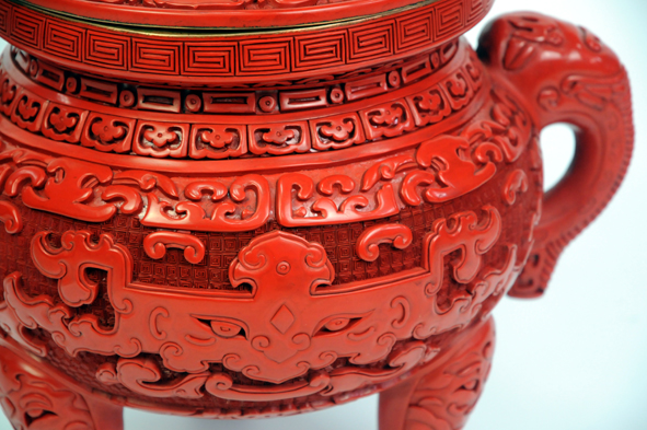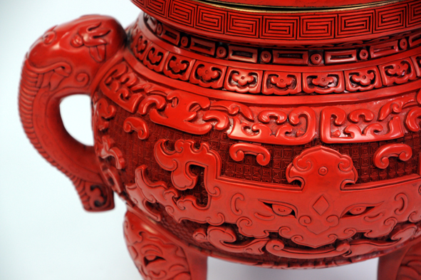 銅胎三足香爐為雕漆大師楊之新所作。爐身及爐蓋刻有傳統(tǒng)圖案饕餮紋,象鼻雙耳,器形穩(wěn)重,雕刻精細。
