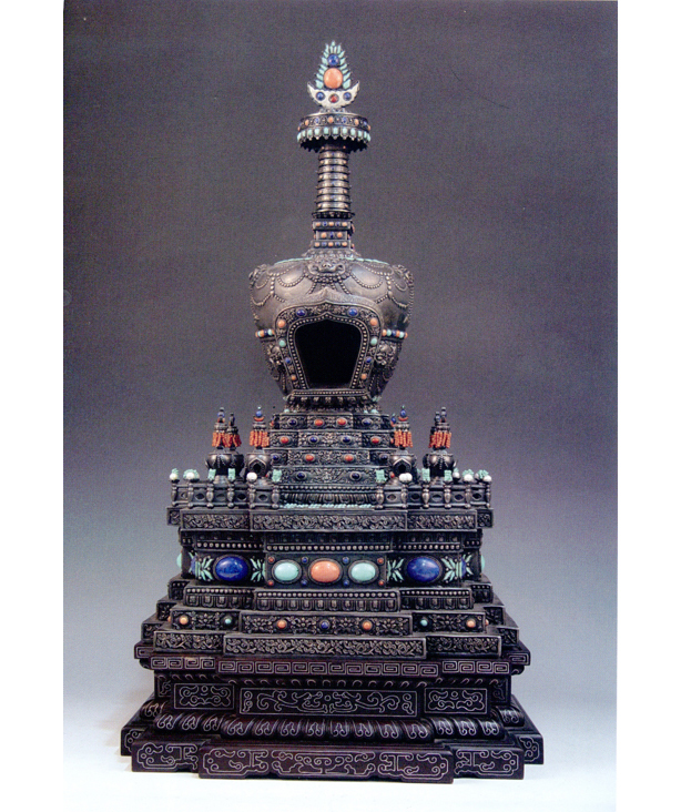 本品為北京市金屬工藝品廠有限責(zé)任公司仿制故宮珍寶館的藏式舍利塔制作。整塔由塔座、塔身、塔尖三部分組成,高度為52厘米。塔身鑲嵌各種珍珠、寶石等,紋飾精美,工藝精湛,是佛塔工藝品中的精品。