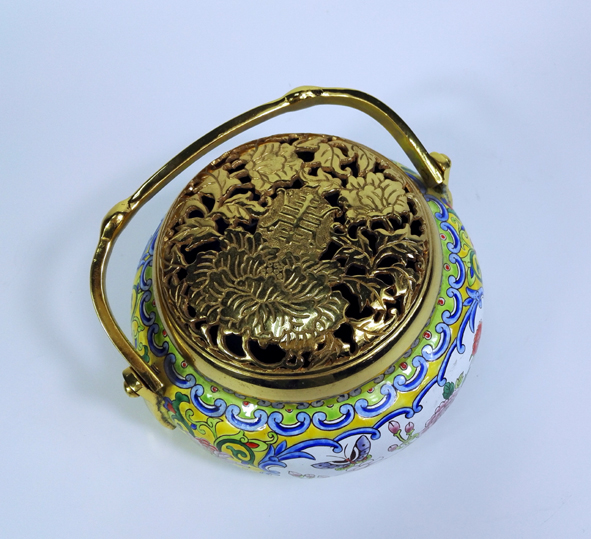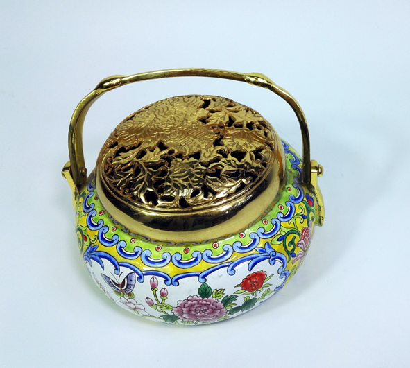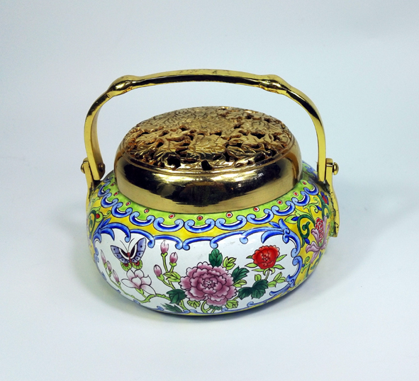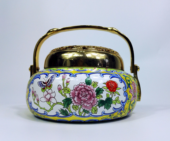 銅胎畫琺瑯,又稱“洋瓷”,與景泰藍(lán)同為中國傳統(tǒng)琺瑯工藝的兩大瑰寶,享譽(yù)中外。此件畫琺瑯暖手爐專為新版紅樓夢劇組定制,是賈母手持之物。