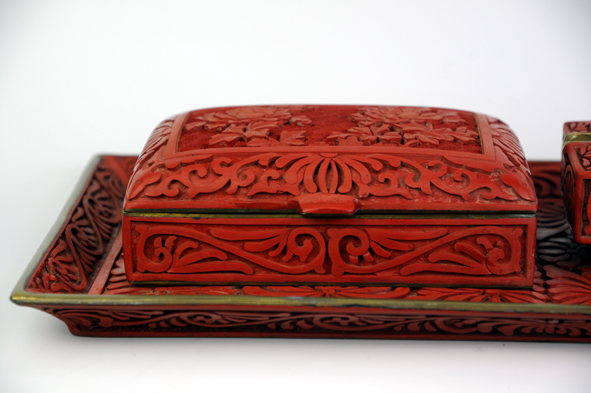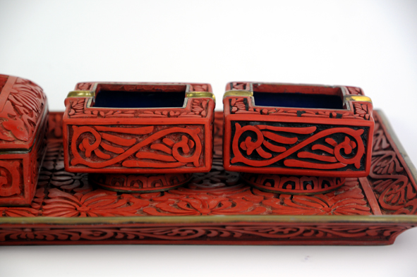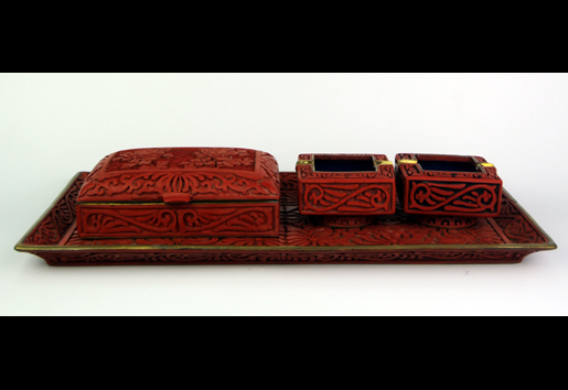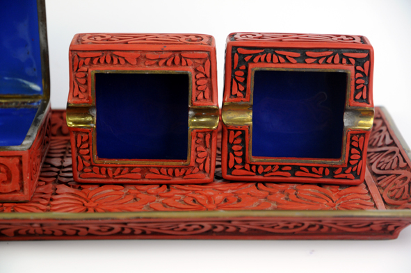 煙具套裝共四件,一個(gè)托盤,一個(gè)翻蓋煙盒,兩個(gè)煙缸。都為銅胎上雕漆?;y統(tǒng)一,精美富貴。