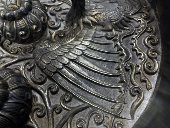 仿故宮清代金銀器。原物為金胎,本企業(yè)制作的為純銀之材。制作時間為上個世紀八十年代,由我公司金屬鍛鏨技藝第二代傳承人、工藝美術大師康文昇高級技工制作。盆邊鏨鐫十二雜寶吉祥圖案,并鑲嵌各種高檔寶石。底內(nèi)后嵌,鏨鐫花紋中立雙鳳和三朵寶相花。