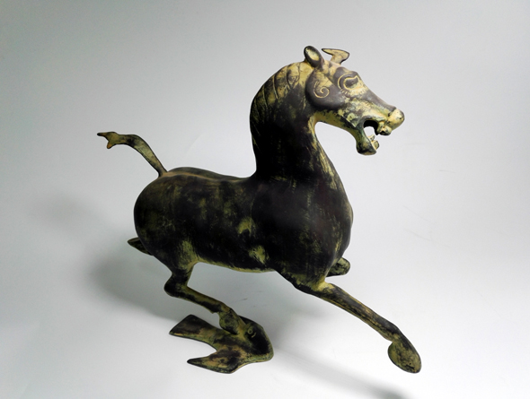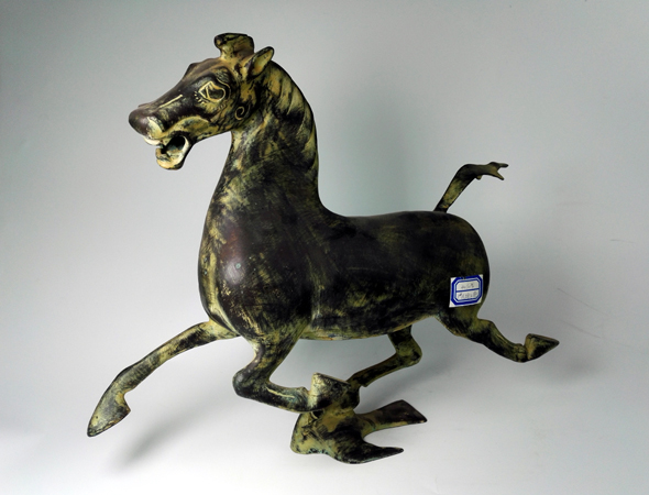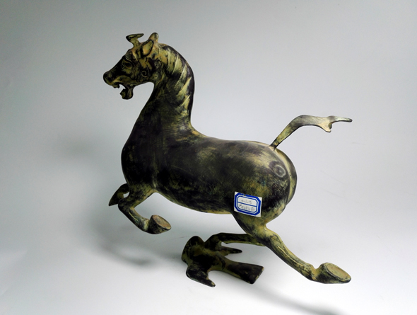 馬踏飛燕身高34.5厘米,身長(zhǎng)45厘米,寬13厘米?!榜R踏飛燕”自出土以來(lái)一直被視為中國(guó)古代高超鑄造業(yè)的象征。 [2]