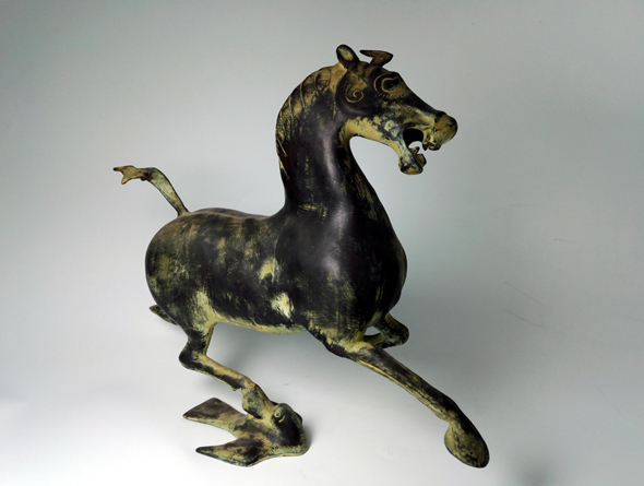 從力學(xué)上分析,馬踏飛燕為飛燕找到了重心落點(diǎn),造成穩(wěn)定性。這種浪漫主義手法烘托了駿馬矯健的英姿和風(fēng)馳電掣的神情,給人們豐富的想象力和感染力。既有力的感覺(jué),又有動(dòng)的節(jié)奏。馬踏飛燕也是中國(guó)青銅藝術(shù)的奇葩。