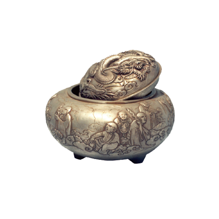 熏爐為點燃香料熏香所用。采用純銀997克,結(jié)合了手工鍛鏨中的平雕、浮雕和圓雕技法制作而成。爐身花紋為佛教故事十六羅漢圖案,爐蓋紋飾為一條騰空的大龍,喻意消除煩惱,不再生死輪回受人間之苦。