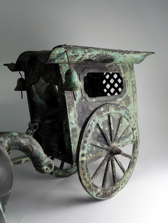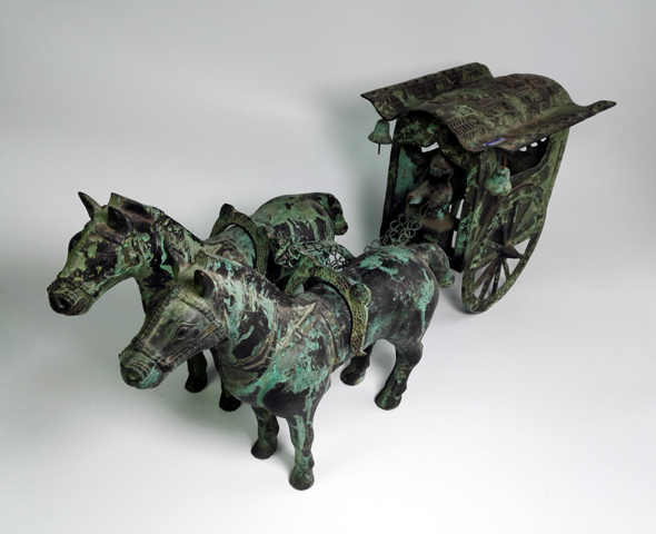 銅車馬是秦始皇陵的大型陪葬銅車馬模型,1980年出土于中國陜西臨潼秦始皇陵墳丘西側(cè)。共兩乘,一前一后排列。經(jīng)復原,大小約為真人真馬的二分之一。制作年代約在陵墓興建時期,即公元前221~前210年間。(此件產(chǎn)品為我公司制作的仿制品)