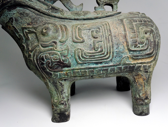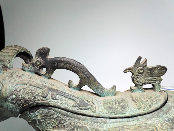 容酒器 商代后期作品。此器以綿羊?yàn)樵煨停w采用龍、鳳、鳥等各種神話傳說動(dòng)物吉祥裝飾,表現(xiàn)出強(qiáng)烈的祭器特征,周邊紋飾精美,充分體現(xiàn)羊在古代象征富裕的特征,寓意財(cái)運(yùn)亨通。